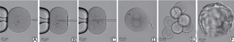 A shows the fixed egg; B shows the membrane puncture; C shows the sperm injection; D shows normal fertilization on the 1st day; E shows the 8-cell embryo on the 3rd day; F shows the blastocyst on the 5th day.