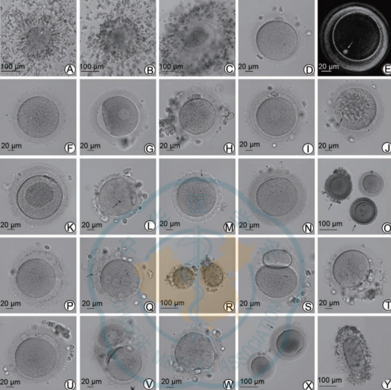 A shows COC (mature eggs, cumulus cells are loose, and the arrow indicates Pb1); B shows COC (immature eggs, cumulus cells are dense, and Pb1 is not seen); C shows COC (degenerated eggs and zona pellucida is ruptured); D Shows a normal morphological egg; E shows a normal morphological egg under a polarized light microscope, with the spindle (indicated by the arrow) located just below the polar body; F shows an MⅠ egg; G shows a GV egg; H shows a rough cytoplasm with obvious and uniform granularity; I shows that smooth endoplasmic reticulum clusters can be seen in the cytoplasm, which is as smooth as a disc; J shows that there are multiple vacuoles in the cytoplasm (with a sunken feeling, the largest vacuole diameter is about 16 μm, indicated by arrows); K shows that the cytoplasmic organelles are aggregated in the center The area has obvious granularity; L shows abnormal ZP, which is agar/wax-like, without PVS, and refractive bodies appear in the cytoplasm (arrow, about 5 μm); M shows abnormal ZP, with jagged edges, and Pb1 is crescent-shaped (arrow) shown), no PVS; N indicates ZP thickening (>20 μm is thickening); O indicates ZP coloration and decreased transparency (the arrow indicates the egg); P indicates enlarged PVS (can accommodate at least 2 normal-sized Pb1 ); Q indicates the ZP interlayer (indicated by the arrow); R indicates a large number of particle fragments in the PVS; S indicates giant Pb1 (long diameter about 80 μm); T indicates multiple and larger Pb1; U indicates fragmented Pb1 and increased PVS; V Shows conjoined eggs; W shows irregular membrane; Eggs; Smooth endoplasmic reticulum clusters (SERc), large vacuoles (diameter >14 μm) or multiple small vacuoles, accumulation of cytoplasmic organelles, serrated or waxy zona pellucida, and multiple abnormal egg morphology will affect fertilization, embryonic development and pregnancy. The outcome will have a greater negative impact, but some eggs can still be used to obtain healthy live babies through ICSI. Therefore, it is recommended that these eggs be specially marked and not be used as the first choice for transplantation.