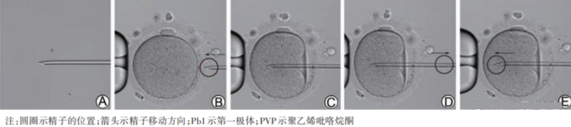 A shows that the middle or lower section of the sperm tail is gently pressed to brake; B shows that the position of Pb1 is adjusted and the egg is fixed, and the needle tip is against the zona pellucida and the sperm is moved to the needle tip; C shows that the sperm breaks through the zona pellucida and penetrates into the cytoplasm, but at this time it does not The membrane is not broken; D indicates that when the cytoplasm flows into the needle instantaneously (the membrane is broken), the negative pressure is immediately terminated; E indicates that the sperm enters the cytoplasm, and PVP injection should be avoided.